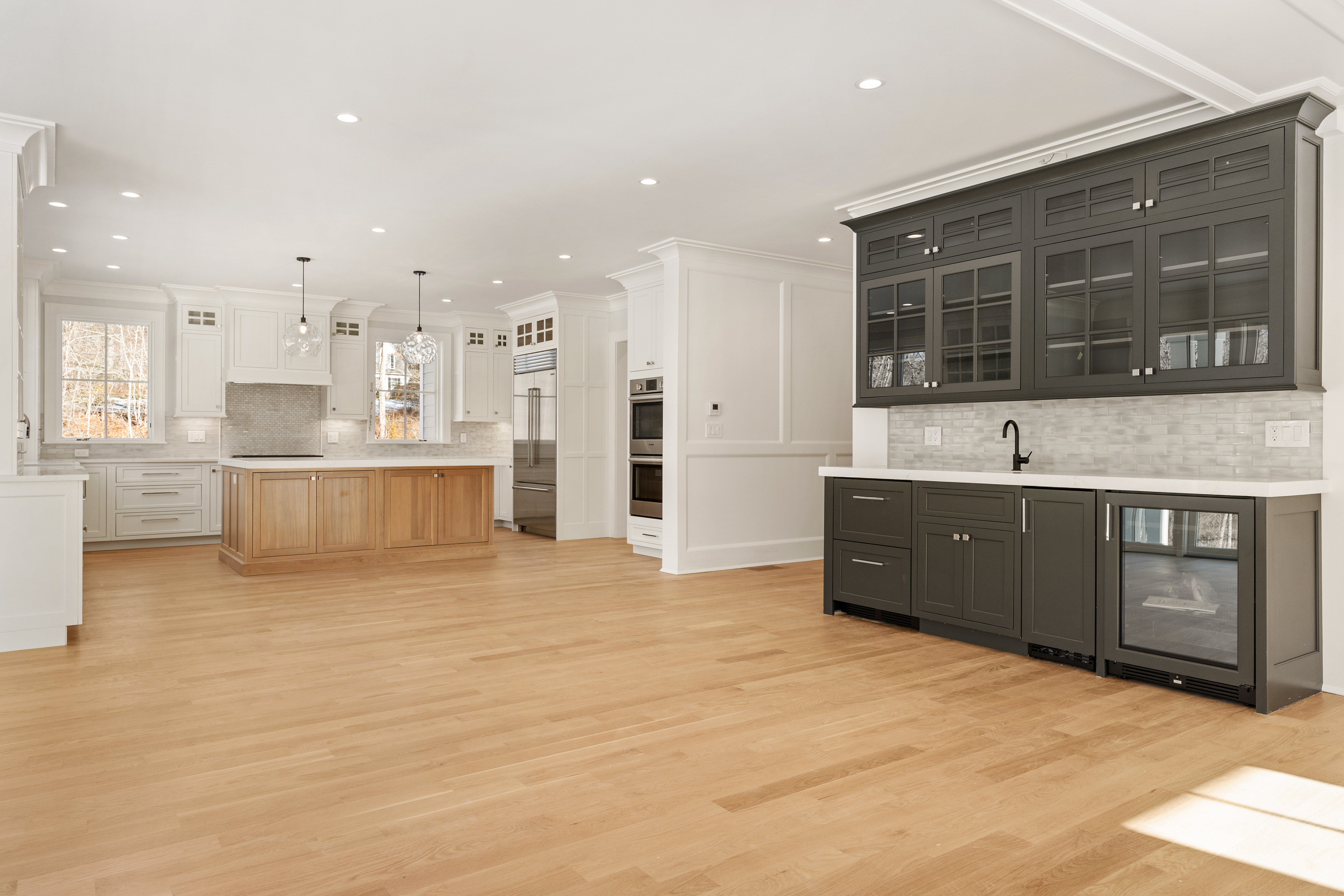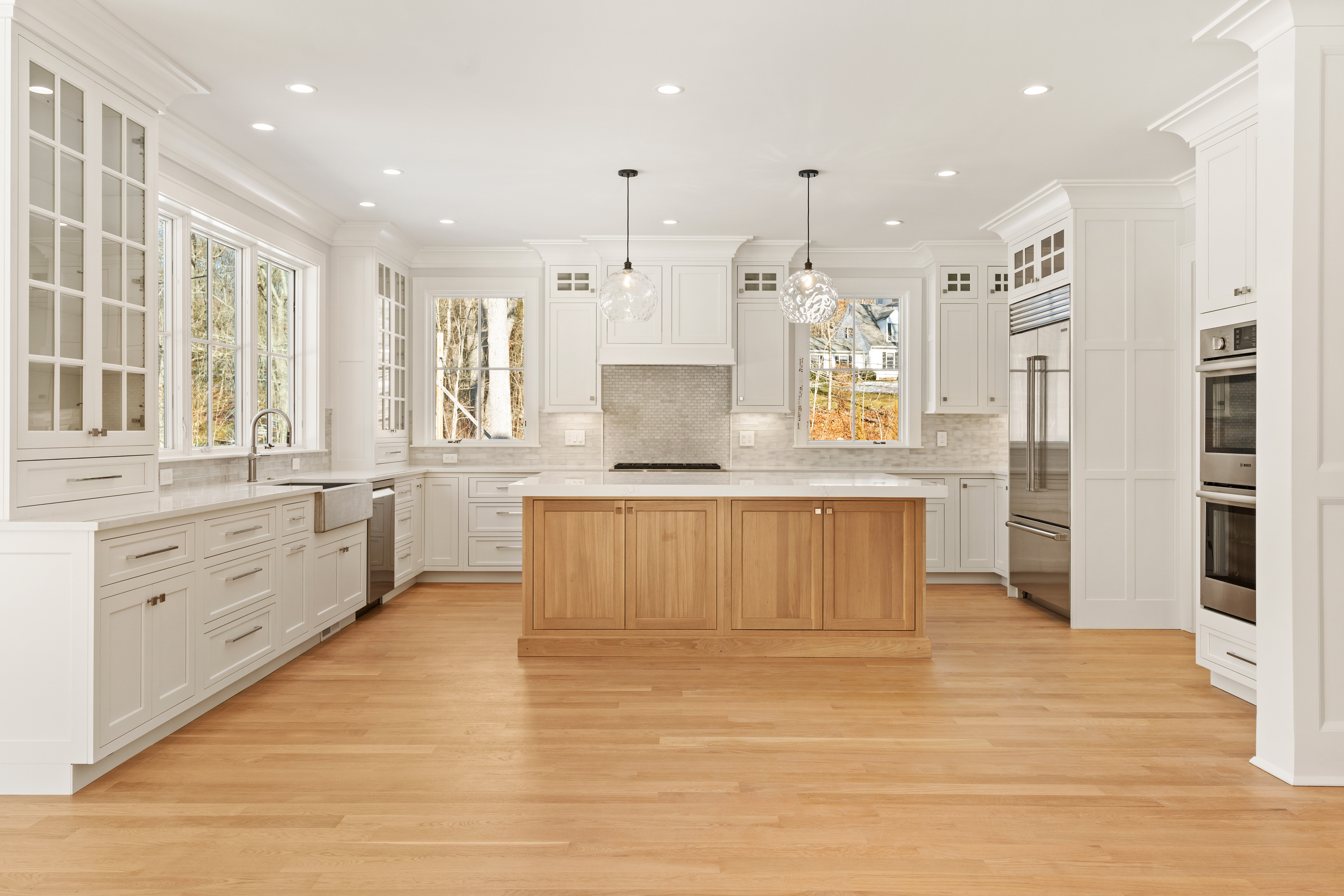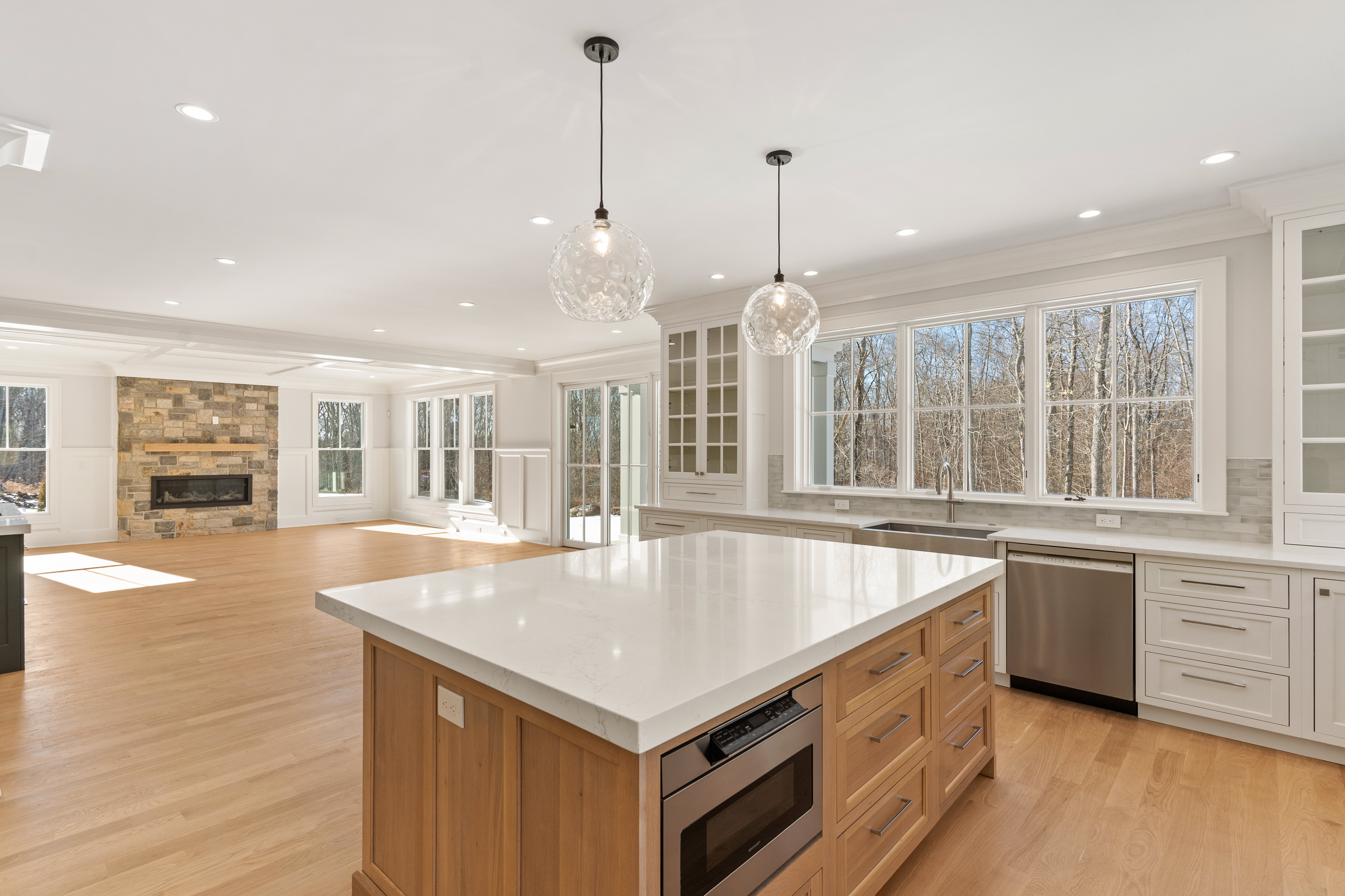 Built by a highly regarded shoreline builder known for uncompromising attention to detail, this residence is designed for buyers who appreciate elevated finishes, enduring quality, and effortless livability. The home features an open floor plan with white oak hardwood floors, 9-foot ceilings, custom millwork, and oversized Pella windows throughout. A stunning bluestone entry leads to an elegant interior anchored by an eat-in kitchen with a 5′ x 7.5′ quartz island, Sub-Zero refrigeration, a six-burner Wolf gas range, double wall ovens, farmhouse sink, and wet bar with wine chiller and refrigerator drawers. The living room offers coffered ceilings, a stone-surround gas fireplace, and sliding doors to a partially covered bluestone patio, creating seamless indoor-outdoor living. The primary suite is a private retreat with a spa-inspired bath featuring a soaking tub, oversized rain shower, dual vanities, and a walk-in closet. Three additional bedrooms each include en-suite baths, complemented by a bonus room with cathedral ceilings and full bath. Additional highlights include a private office, formal dining room, custom pantry and mudroom, set up for a generator, and a well-appointed laundry room.