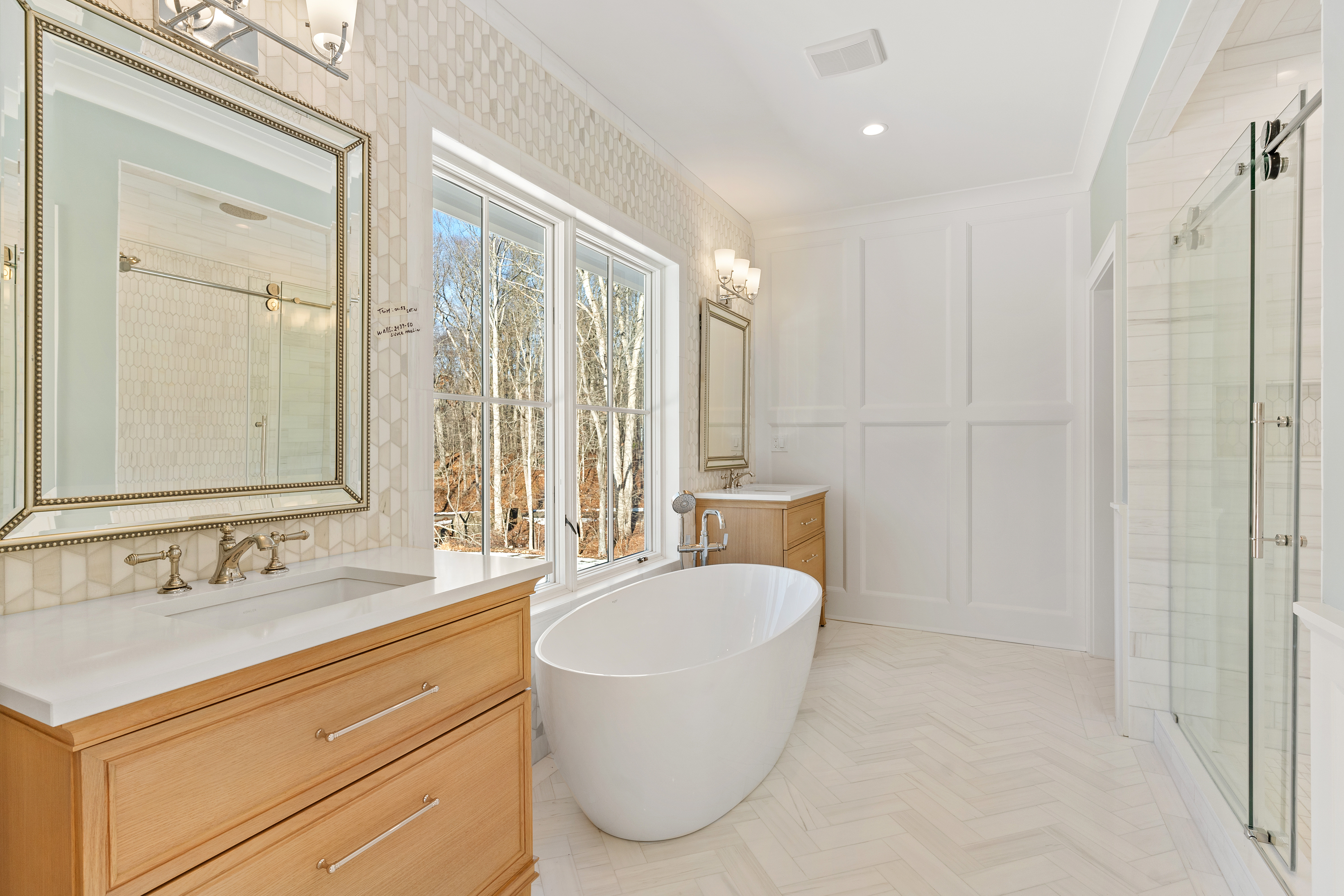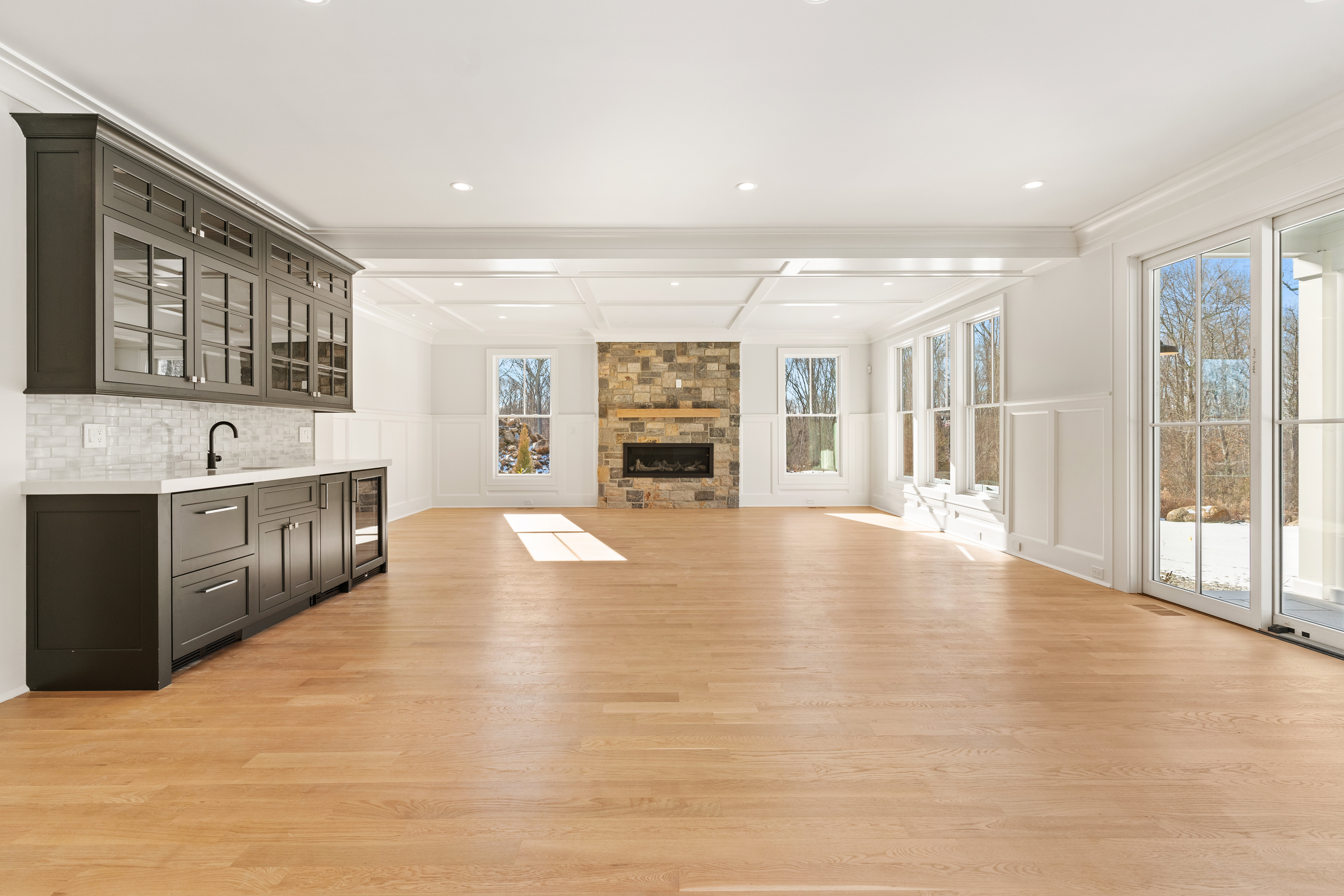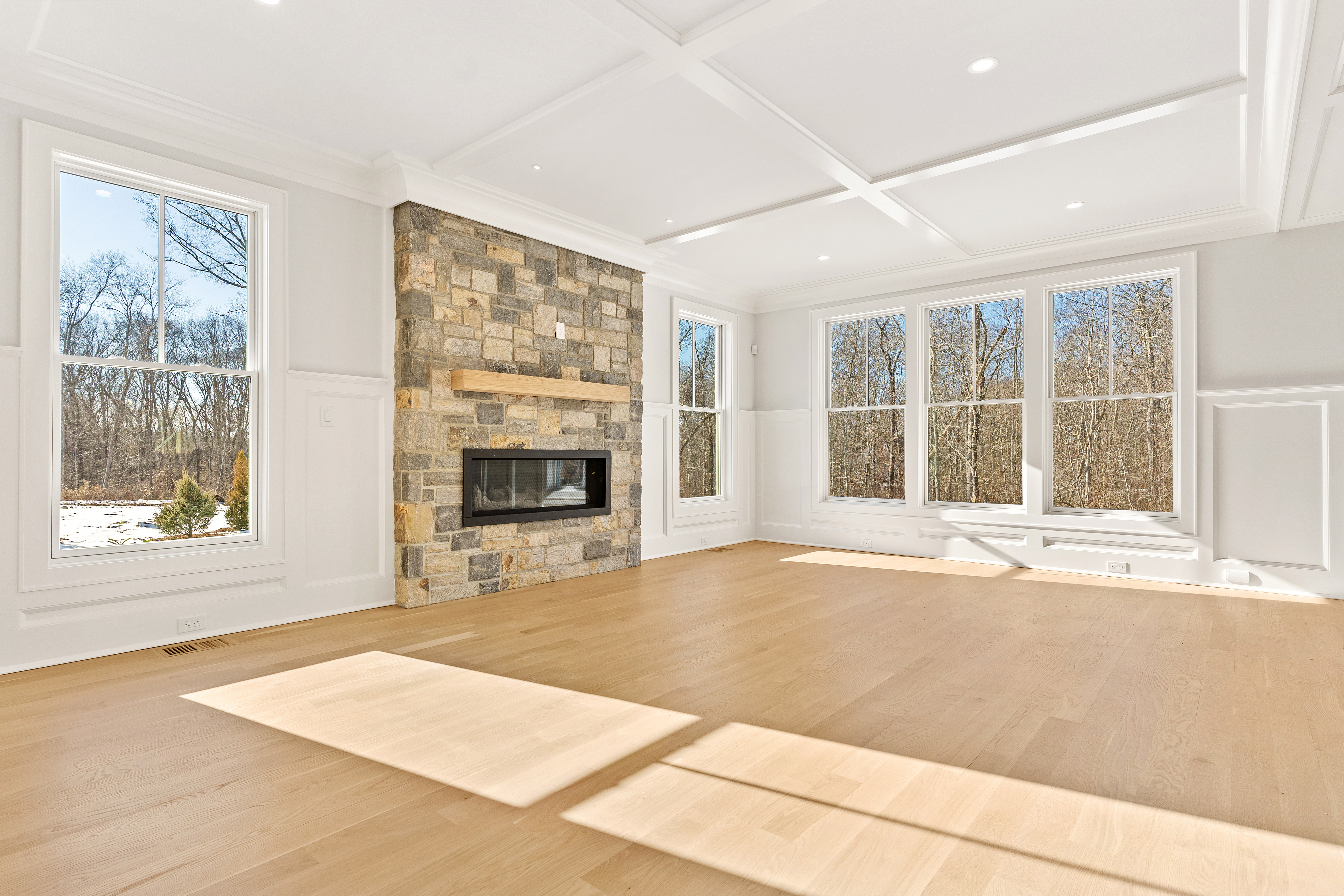 Built by a highly regarded shoreline builder known for uncompromising attention to detail, this residence is designed for buyers who appreciate elevated finishes, enduring quality, and effortless livability. The home features an open floor plan with white oak hardwood floors, 9-foot ceilings, custom millwork, and oversized Pella windows throughout. A stunning bluestone entry leads to an elegant interior anchored by an eat-in kitchen with a 5′ x 7.5′ quartz island, Sub-Zero refrigeration, a six-burner Wolf gas range, double wall ovens, farmhouse sink, and wet bar with wine chiller and refrigerator drawers. The living room offers coffered ceilings, a stone-surround gas fireplace, and sliding doors to a partially covered bluestone patio, creating seamless indoor-outdoor living. The primary suite is a private retreat with a spa-inspired bath featuring a soaking tub, oversized rain shower, dual vanities, and a walk-in closet. Three additional bedrooms each include en-suite baths, complemented by a bonus room with cathedral ceilings and full bath. Additional highlights include a private office, formal dining room, custom pantry and mudroom, set up for a generator, and a well-appointed laundry room.